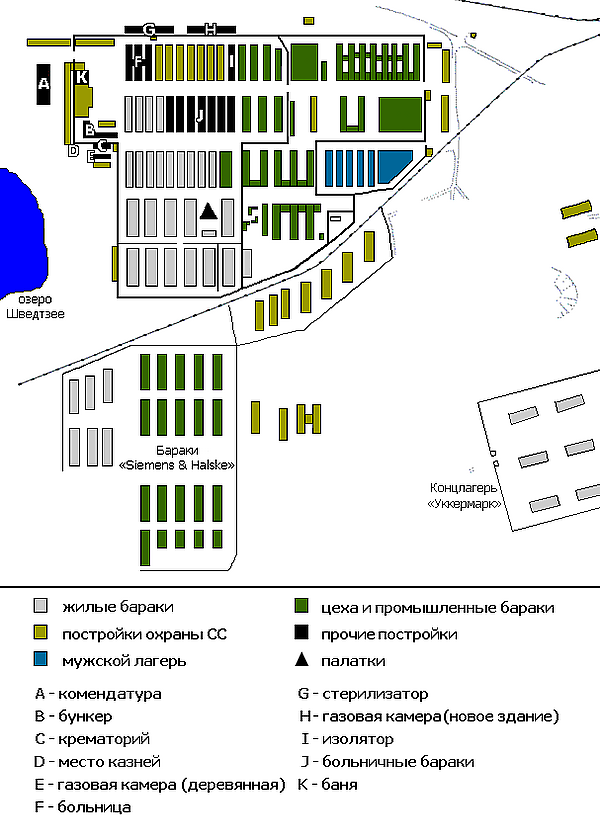 | Мемориальная стела «Несущая» Вилла Ламмерта на озере Шведтзее | Бывшая комендатура СС. Ныне музей | Жилой дом охранников СС и младшего командного состава | Жилая зона охранников СС | |||||