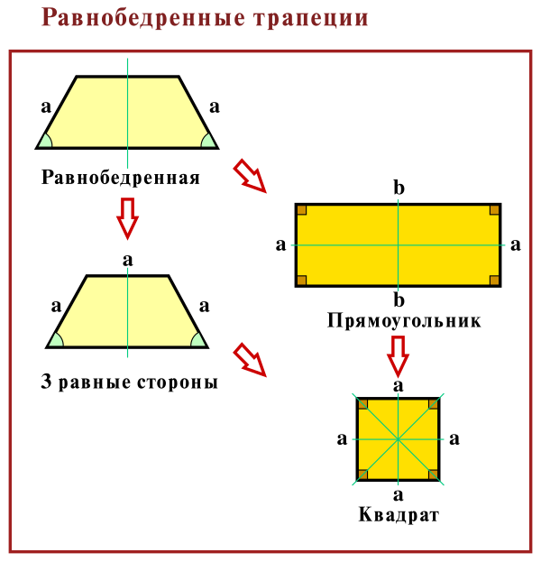 Прямоугольники и квадраты обычно рассматриваются как специальные случаи равнобедренных трапеций, хотя в некоторых источниках они таковыми не считаются.