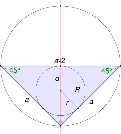 Равнобедренный прямоугольный треугольник, как и все треугольники, является бицентрическим. В нём: