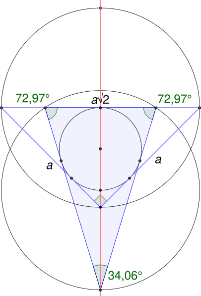 Равнобедренный треугольник, имеющий равные описанную и вписанную окружность и одинаковые расстояния между их центрами (), имеет углы: