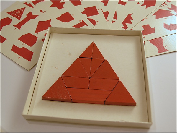 Пять равнобедренных прямоугольных треугольников вместе с одним квадратом и одним параллелограммом образуют головоломку пазл.