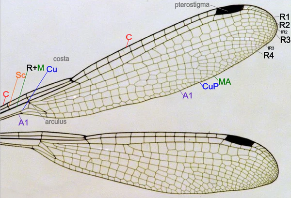 На каждом крыле имеется шесть основных продольных жилок[5][6]: