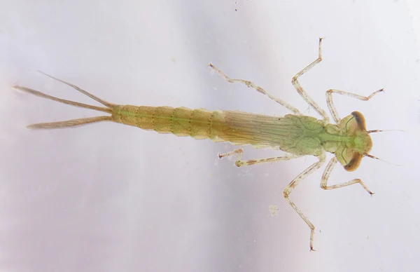 - Широкожаберные личинки, обитающие в стоячих водоёмах. Характерны для многих равнокрылых стрекоз (кроме красоток). Активно плавают, при этом гребут ногами и изгибают тело. Ловят мелкую добычу (личинок насекомых и ракообразных).