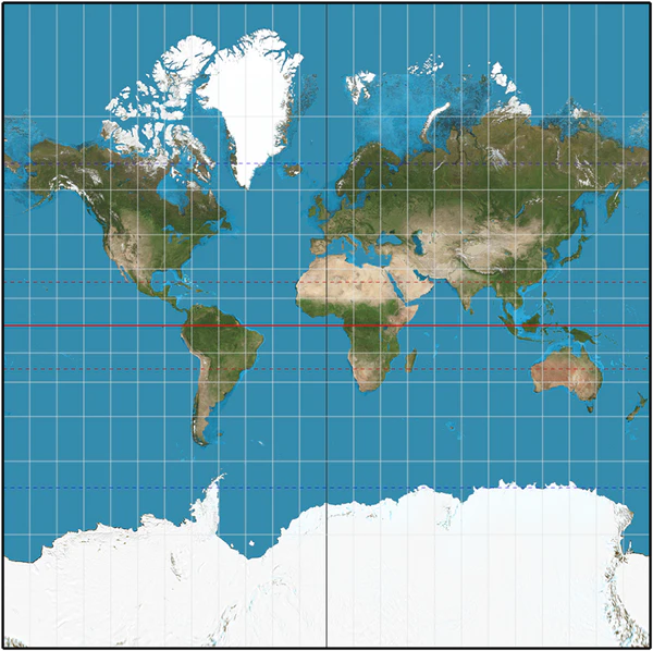 - Проекция Меркатора (зачастую просто «равноугольной проекцией» называют именно её) — нашла широкое применение в морском деле, в том числе и для карт мира.