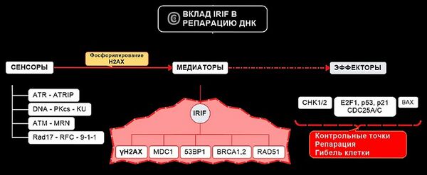 Фосфорилированный белок, который обозначается как γH2AX , необходим для привлечения к участию в репарации многих других белков с последующим образованием IRIF.