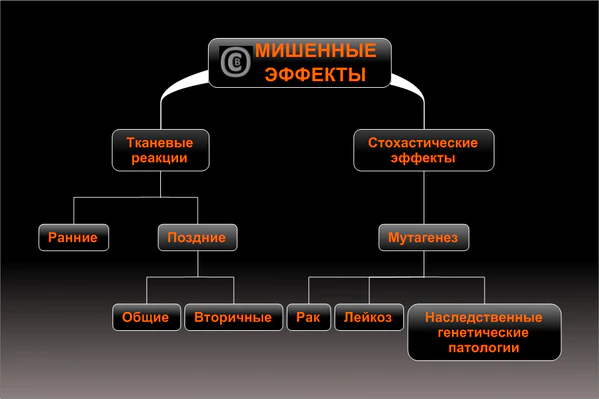 Мишенные радиобиологические эффекты состоят из двух групп — детерминированные и стохастические. По новой терминологии МКРЗ[2], вместо термина «детерминированные эффекты» используется наименование «тканевые реакции».