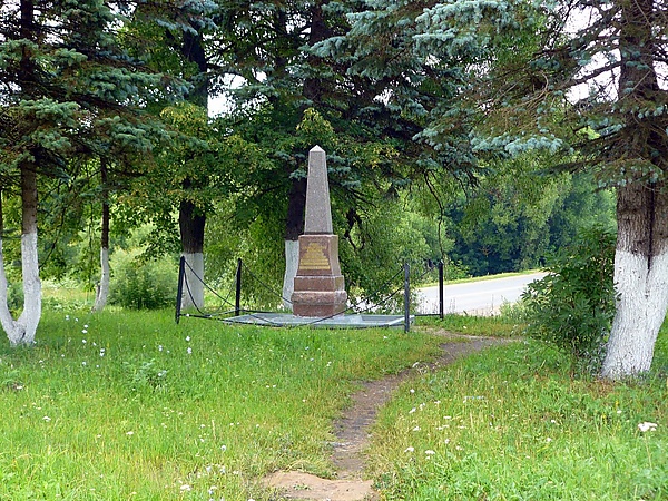 Начинается межа нашего владения, и дорога спускается по пригорку, и подъехав к спуску, довольно крутому, едва по мелкому камню текущей речки, по левую сторону виден пространный яблоневый сад, плетнем огороженный, за ним высокая роща, несколько хижин, покрытых соломою, между ними видны остатки каменного дома, который даже в развалинах своих ничего готического не представляет. В правую сторону от дороги, за речкою, построена деревня, из 36 дворов состоящая. Прямо против двора, при въезде стоят три березы, современницы моего детства, так напомнившие мне о беззаботном начале жития человеческого и нередко о горестном его окончании.