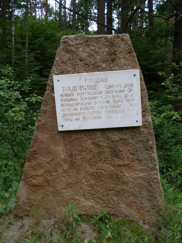 Древнейшее укреплённое поселение построено балтами во времена железного века. Предположительно, что Радовище стало первым поселением, основанным балтами на территории Орловщины по пути продвижения северных племён на юг. Основой хозяйства верхнеокских балтов было скотоводство, земледелие, рыболовство, собирательство. Были развиты: получение железа, бронзолитейное мастерство, косторезанье, прядение, ткачество. Поселение представляло собой небольшое укреплённое городище близ земледельческих полей. По типологии данное поселение относится к «болотному типу». В плане овальное поселение возвышалось на 2,5 метра и являлось островом посреди болота. Оно окружалось кольцевым валом и перед валом имелся кольцевой ров глубиной до двух метров, заполненный болотной водой. Городище Радовище открыл в 1902 году орловский краевед В. Р. Апухтин. Раскопки проводились в 2004—2006 годах археологической экспедицией Орловского краеведческого музея под руководством С. Д. Краснощёковой, при поддержке управления по туризму и краеведению администрации Орловской области. Также в раскопках принимали участие студенты кафедры сервиса и туризма ОГУ[2]. Найдены многочисленные обломки грузил для сетей — свидетельства рыболовства, глиняные фигурки людей — вероятность нахождения здесь культового места, много фрагментов лепной керамики. В полутора километрах от городища сохранился курганный могильник, принадлежащий уже не балтам, а славянам — вятичам и относится к XI—XIII векам. Славяне — вятичи, пришедшие сюда, по своим обычаям сжигали своих умерших[3][4].