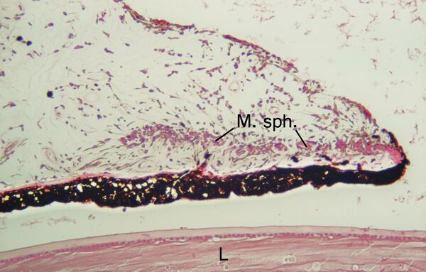 Место соединения радужки с ресничным (цилиарным) телом называется корнем радужки, остальная часть радужки находится в свободном взвешенном состоянии в жидкости передней и задней камер глазного яблока. В месте соединения корня радужки и задних слоёв роговицы расположены структуры угла передней камеры (радужно-роговичный угол), обеспечивающие основной отток внутриглазной жидкости. При биомикроскопии отчётливо виден рисунок радужки: она имеет вид губчатой ткани, состоящей из множества радиальных тонких перемычек (трабекул), образованных толстой адвентицией сосудов и окружающей их соединительной тканью. Между трабекулами располагаются углубления (лакуны и крипты). На границе зрачкового и ресничного края радужки определяется зубчатая линия, или круг Краузе (малое кольцо радужки) — область прикрепления эмбриональной зрачковой сосудистой мембраны. Зрачок обрамлён тёмно-коричневой зрачковой каймой. На передней поверхности радужки видны складки радужки, при узком зрачке более рельефно выделяются радиальные складки, при широком зрачке — концентрические. В зрачковом крае радужки голубого цвета виден сфинктер зрачка, имеющий вид розовой ленты, располагающейся вокруг зрачковой каймы[1].
