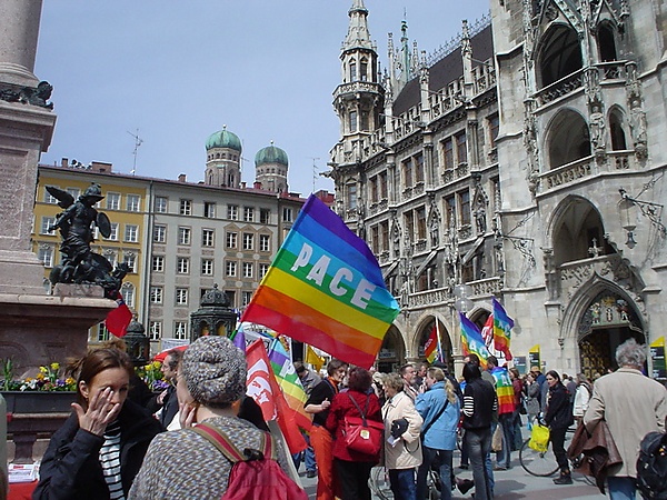 Во время войны в Ираке в 2003 году многие итальянцы последовали призыву «Мир со всех балконов» (итал. Pace da tutti i balconi) и в знак протеста вывесили флаги на балконы, окна и стены домов. Эта кампания имела широкий общественный резонанс, радужное знамя приобрело большую популярность в Италии, а затем и по всей Европе. Одним из основателей нового движения выступил католический священник Алекс Дзанотелли (итал. Alex Zanotelli). Активное участие в акции религиозных деятелей и даже размещение радужных флагов в церквях вызвало осуждение со стороны официального Ватикана, который, в частности, был озабочен невольно возникающими ассоциациями с гей-движением и нью-эйджем[4][22][23][24].