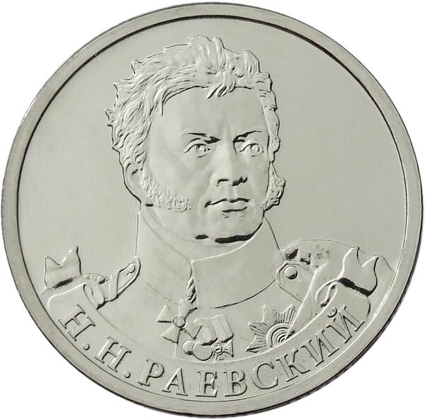 - В 2012 году Центральным банком Российской Федерации была выпущена монета (2 рубля, сталь с никелевым гальваническим покрытием) из серии «Полководцы и герои Отечественной войны 1812 года» с изображением на реверсе портрета генерала от кавалерии Н. Н. Раевского[53].