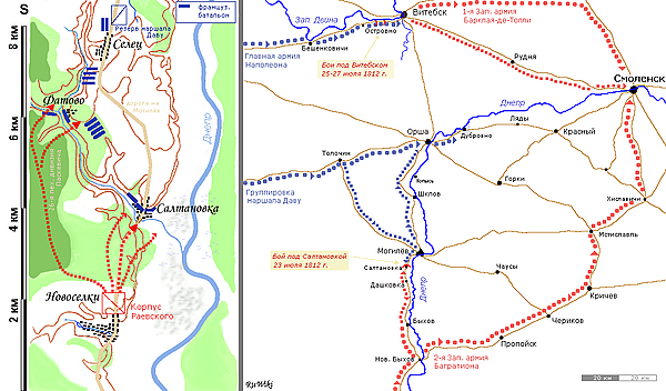 В ночь на 24 июня 1812 года «Великая армия» Наполеона вторглась на территорию России[19]. Раевский на этот момент возглавлял 7-й пехотный корпус 2-й Западной армии генерала П. И. Багратиона. Из-под Гродно 45-тысячная армия Багратиона начала отступление на восток для последующего соединения с армией М. Б. Барклая-де-Толли. С целью не допустить соединения двух русских армий, Наполеон послал наперерез Багратиону 50-тысячный корпус «железного маршала» Даву. 21 июля Даву занял город Могилёв на Днепре. Таким образом, неприятель опередил Багратиона и оказался к северо-востоку от 2-й русской армии. Обе стороны не имели точных сведений о силах противника, и Багратион, подойдя к Днепру 60 км южнее Могилёва, снарядил корпус Раевского, чтобы попытаться отбросить французов от города и выйти на прямую дорогу в Витебск, где по планам должны были соединиться русские армии.