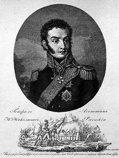 Никола́й Никола́евич Рае́вский (14 [25] сентября 1771 года, Санкт-Петербург, Российская империя — 16 [28] сентября 1829 года, Бовтышка, Киевская губерния, Российская империя) — русский полководец, герой Отечественной войны 1812 года, генерал от кавалерии (1813). За тридцать лет безупречной службы участвовал во многих крупнейших сражениях эпохи. После подвига под Салтановкой стал одним из популярнейших генералов русской армии. Борьба за батарею Раевского явилась одним из ключевых эпизодов Бородинского сражения. Участник «Битвы народов» и взятия Парижа. Член Государственного совета (1826). Был близко знаком со многими декабристами. Дружбой с Раевским гордился А. С. Пушкин[2].