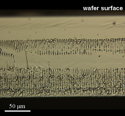 - сквозным разрезанием: за один проход пластину прорезают режущим инструментом (например, алмазным диском или проволокой), что позволяет разрезать пластину толщиной до 1 мм и диаметром 100–150 мм со скоростью до 150 мм/с, на глубину 300 мкм и более.