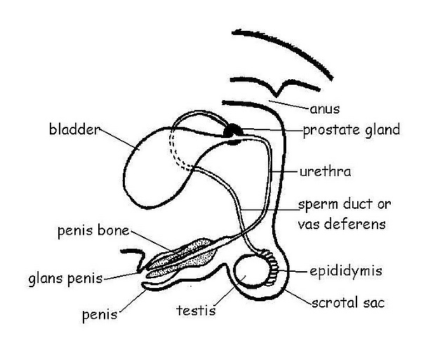Органы размножения самца состоят из семенников, их выводных протоков (придатки семенников, спермиопроводы и мочеполовой канал), предстательной железы, полового члена, препуция и мошонки.