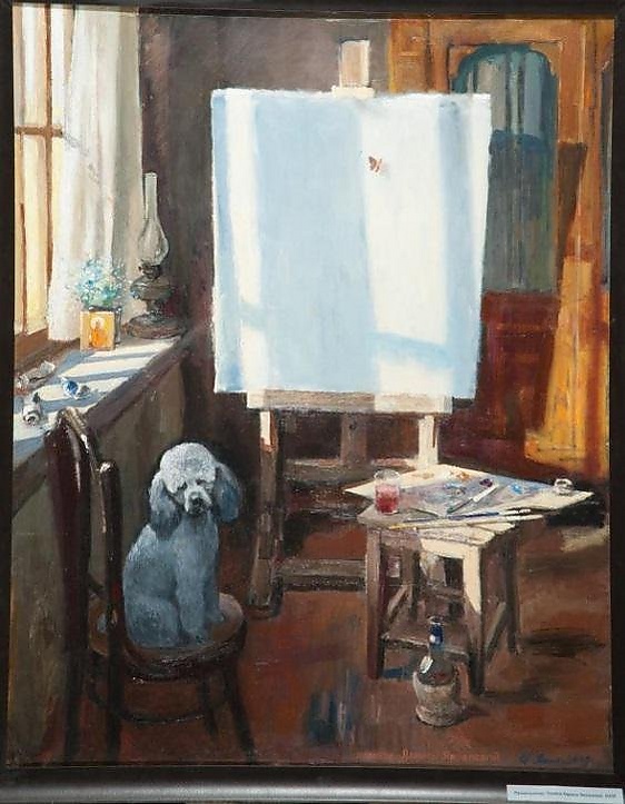 Композиция строится вокруг интерьера мастерской. В центре изображён мольберт с белым холстом, на который села бабочка, оказавшаяся в пятне света. Слева располагается окно, справа перед мольбертом стоит табурет с палитрой и кистями. На переднем плане слева находится Венский стул, на котором сидит белый пудель.