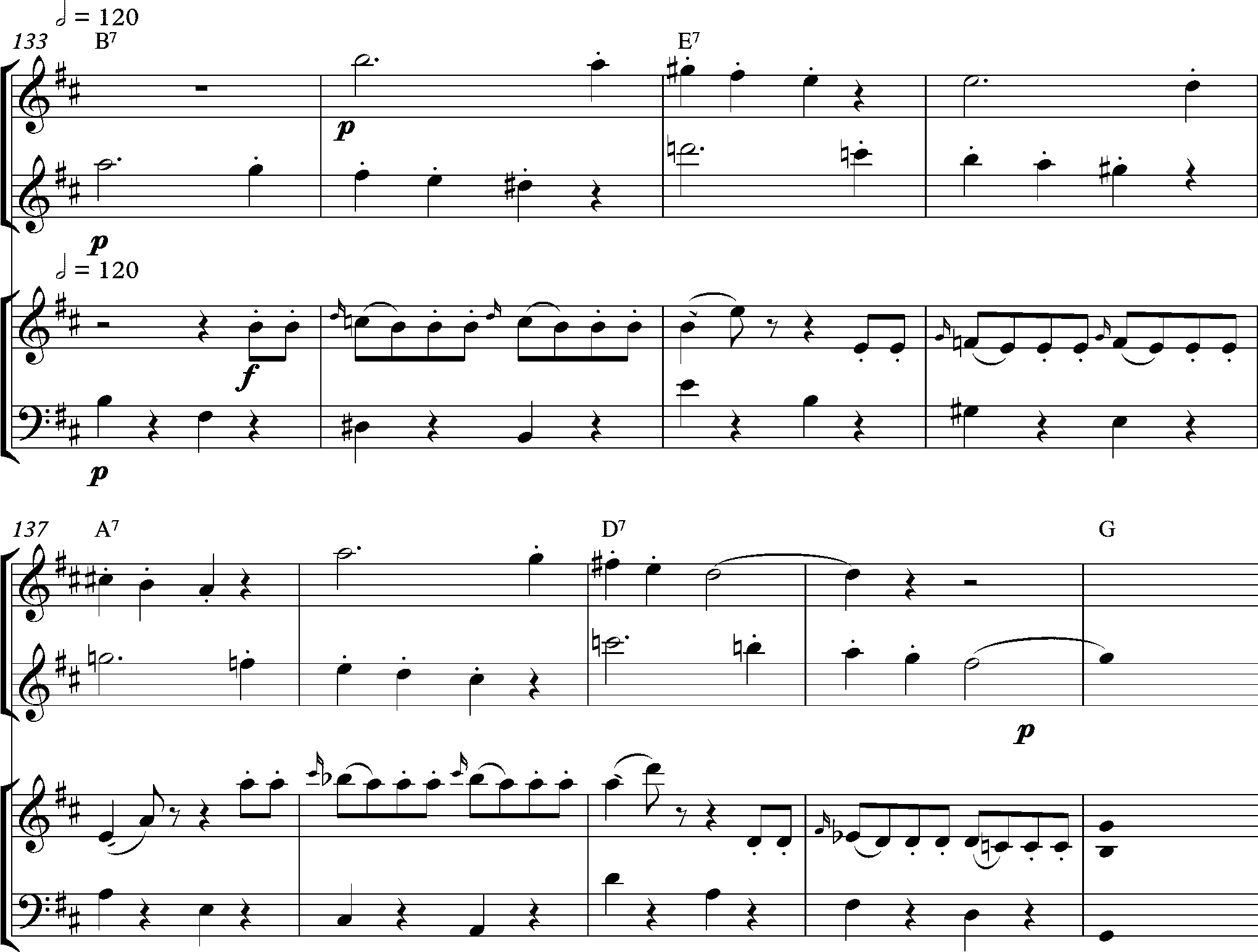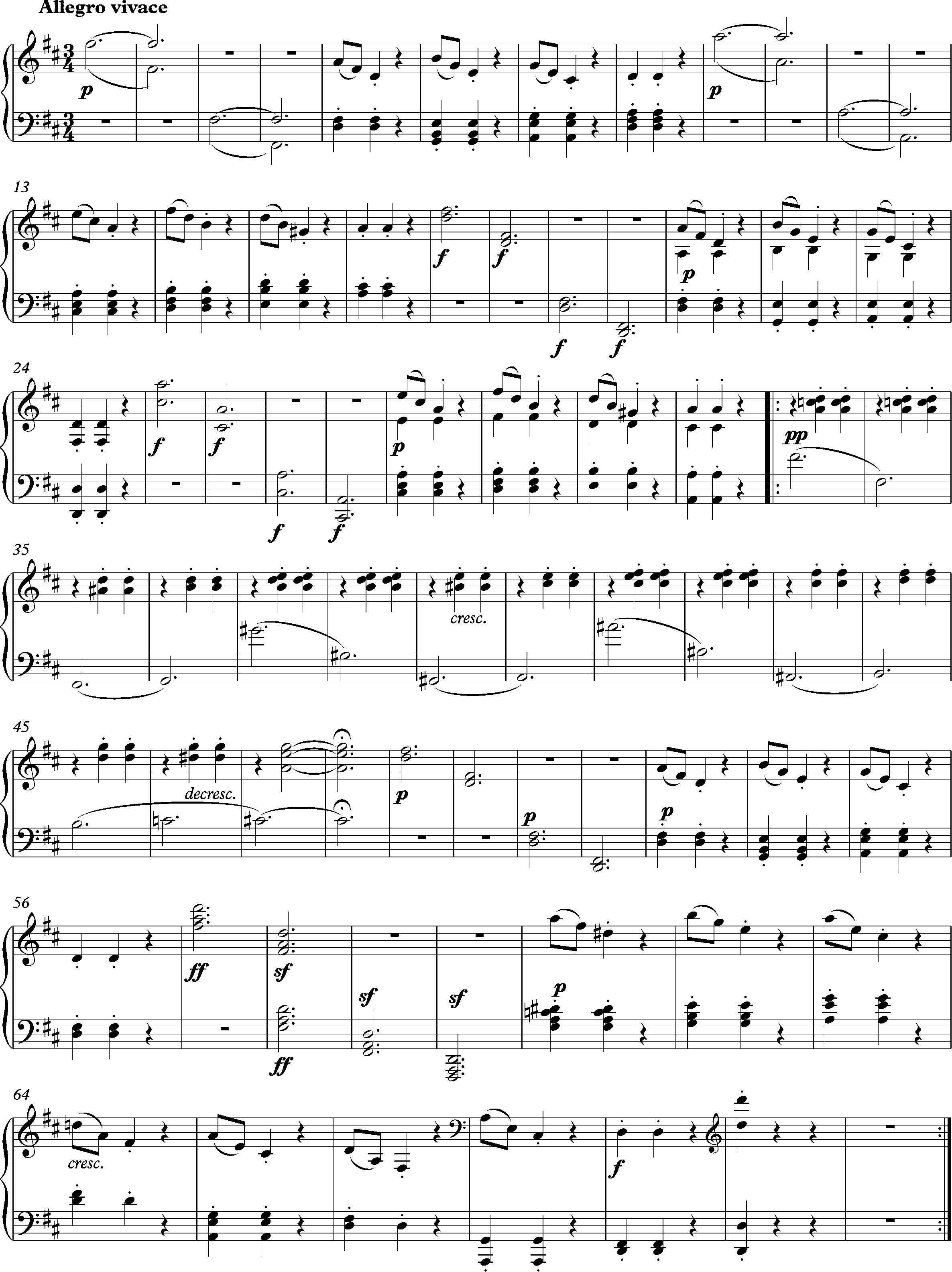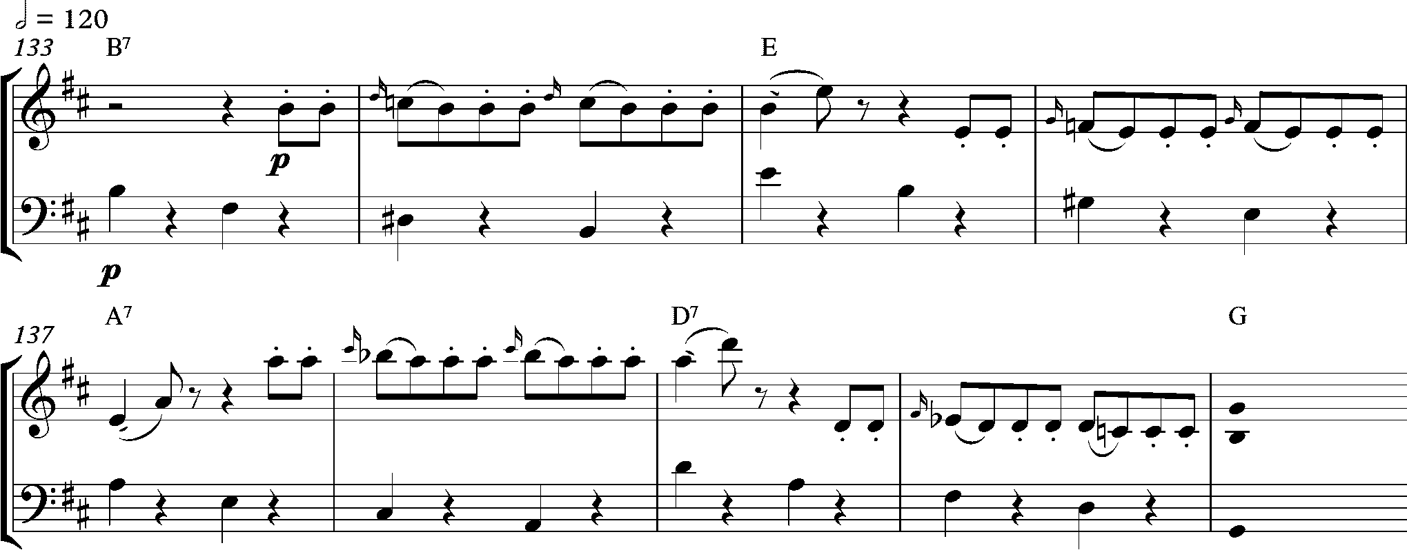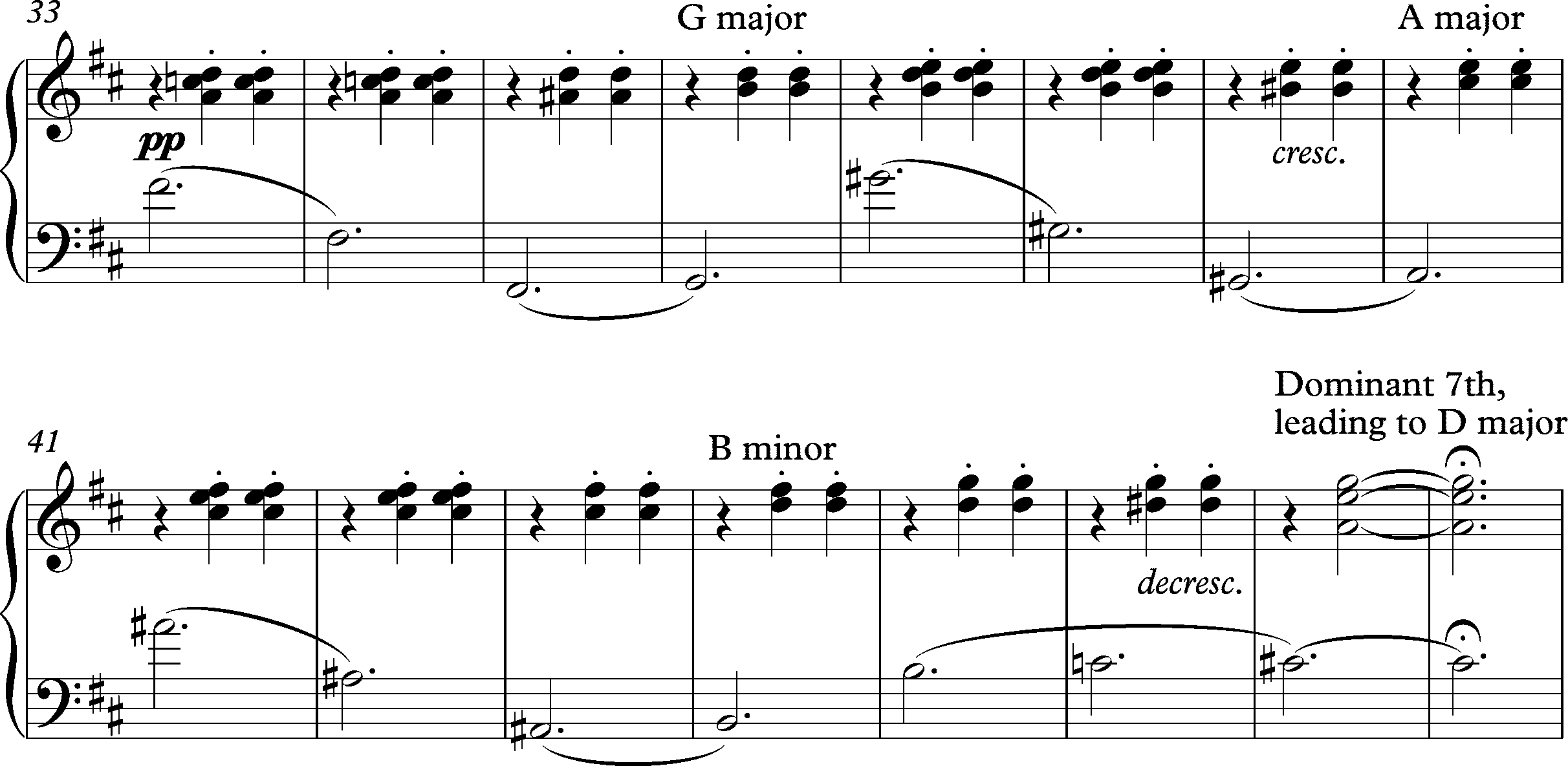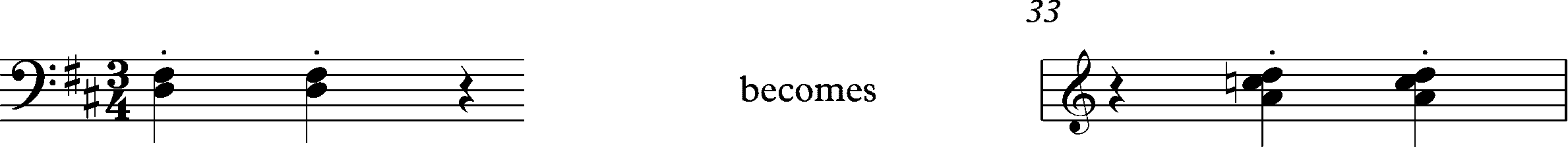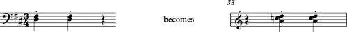 Повторяющиеся аккорды левой руки в такте 5 смещаются так, что начиная с такта 33 они приходятся на вторую и третью доли: