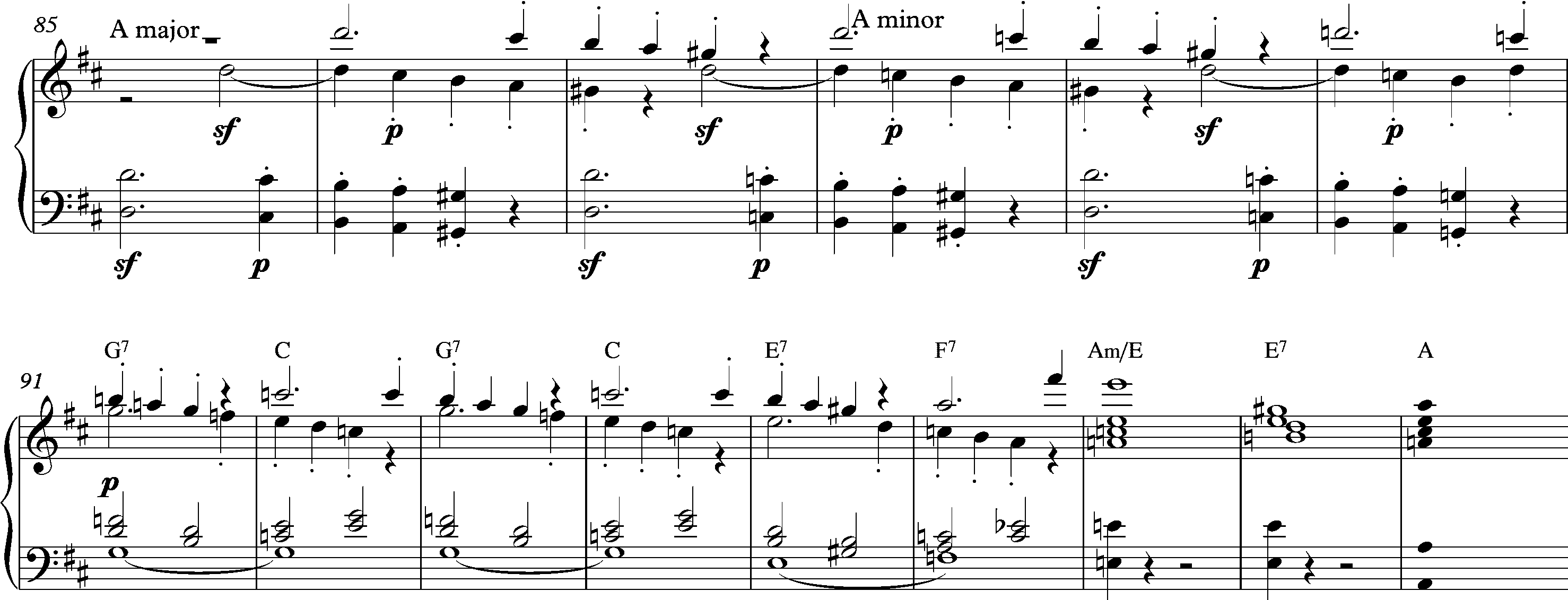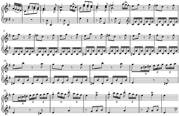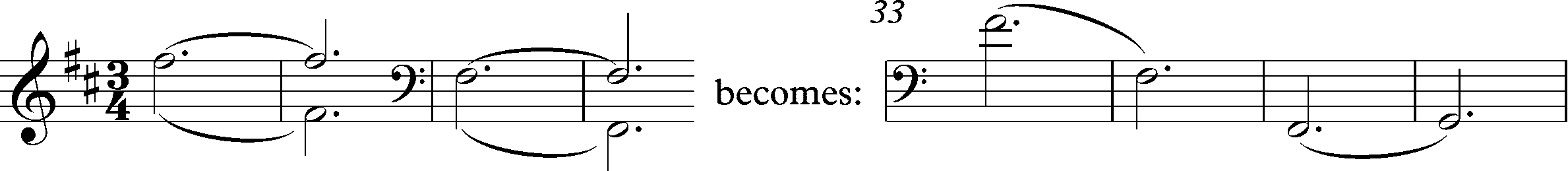Простая идея нисходящей октавы в первых четырёх тактах преобразуется в тактах 33-36 в мотив, завершающийся восходящим полутоном: