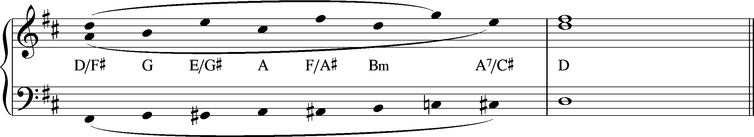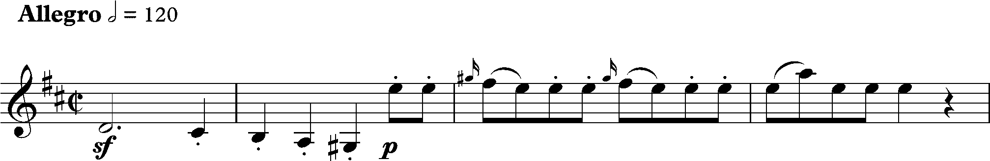 Уильям Мэнн отмечает: «Первая, настойчивая фраза [выше] очень важна. Она сразу же подхватывается имитативно различными группами оркестра и, начинаясь в ля мажоре, перескакивает через несколько родственных тональностей»[5]. Каждое повторение нисходящей фразы изменяется по одной ноте, что приводит к переходу музыки из ля мажора через ля минор и далее через аккорд соль-септаккорда к отдалённой тональности до мажор, а затем обратно к ля мажору.