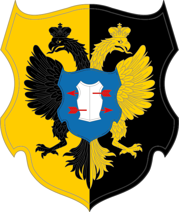 На месте щитодержателей стоят: с одной стороны вооружённый скиф с открытой головой, в левой руке держащий щит, у которого верхнее одеяние голубого цвета, а нижнее — красного, на поясе висят серебряная сабля, в руке золотой скифский лук, за спиной колчан. С другой стороны таким же образом вооружённый поляк с открытой головой, держащий правой рукой щит, у которого верхнее платье красного, а нижнее голубого цвета. В другой руке он держит золотое метательное копьё.