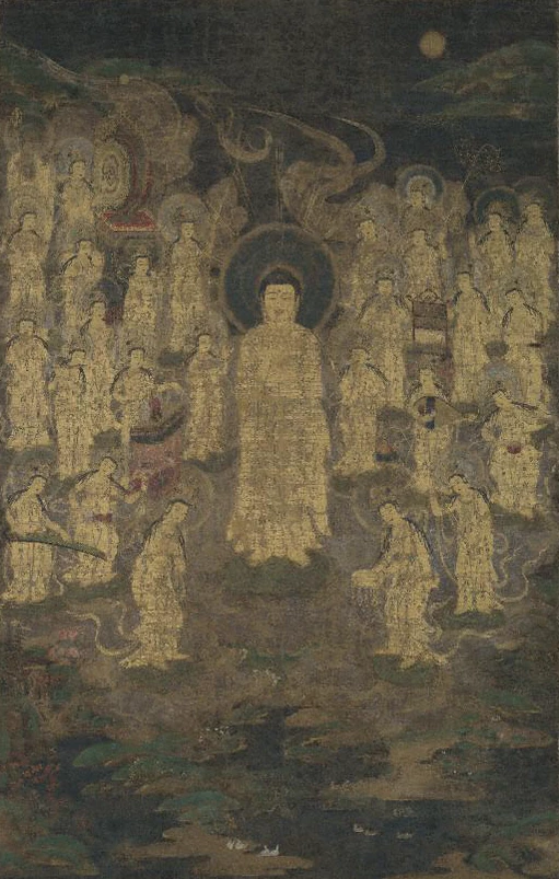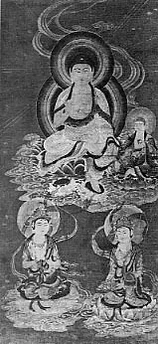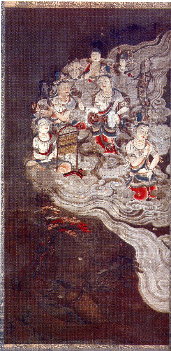 По мере распространения учения школы Чистой Земли следи последователей росло желание видеть изображение главного божества. Результатом стали произведения, изображающие будду Амиду, спускающегося на фиолетовом облаке из далекого Рая Чистой Земли, чтобы встретить души мертвых и забрать их с собой на небеса. Эти картины приносили в дом умирающего. Они назывались райго, и в центре обычно изображался Амида Будда с сопровождающими божествами по обе стороны. Самый известный свиток принадлежит храму Чистой Земли Тион-ин (Киото).[2]