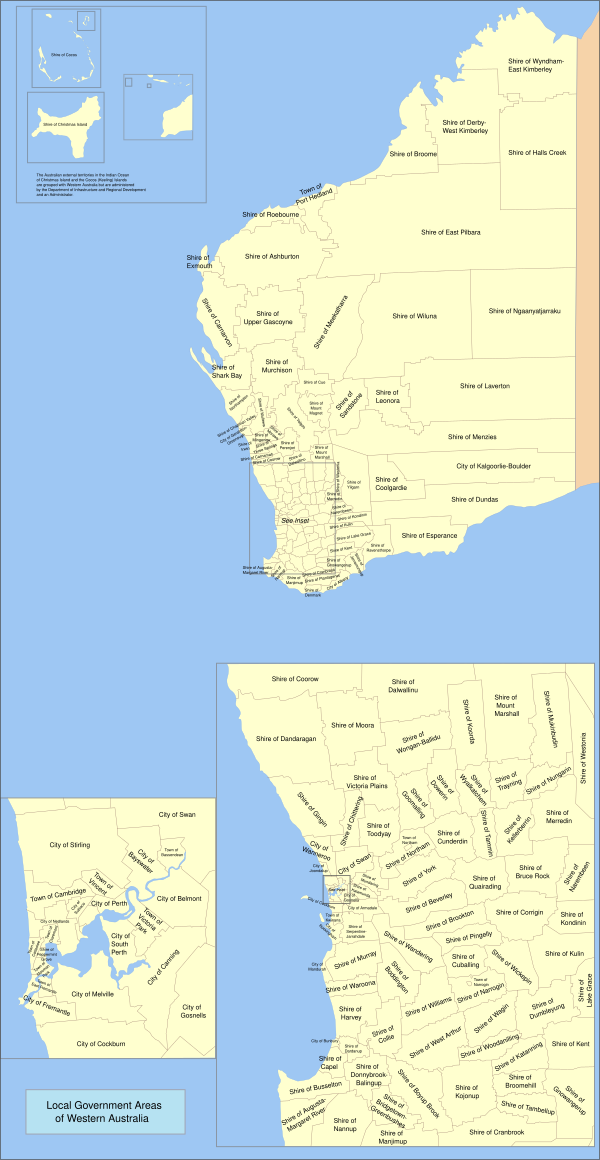Территория австралийского штата Западная Австралия разделена на 144 района местного самоуправления (включая территории острова Рождества и Кокосовых островов). Статус районов и полномочия их органов регулируются Законом о местном самоуправлении, принятом в 1995 году.