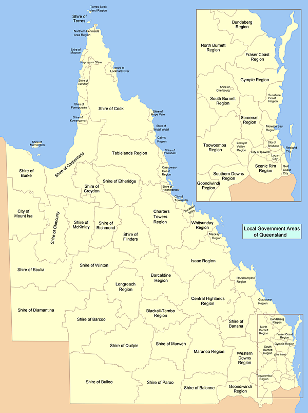 Территория австралийского штата Квинсленд разделена на 73 района местного самоуправления, включая аборигенные советы (англ. Aboriginal council), которые с января 2007 года имеют статус полноправных советов графств (англ. Shire Council). Статус районов и полномочия их органов регулируются Законом о местном самоуправлении, принятом в 1993 году[5].