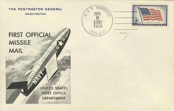 В 1959 году американская почтовая служба сделала успешный запуск крылатой ракеты SSM-N-8 Regulus с подводной лодки Barbero, у которой ядерная боеголовка была заменена специальным почтовым контейнером. Ракета с 3 тысячами почтовых отправлений была запущена в направлении базы ВМС США во Флориде[1]. На конвертах отправленных таким способом писем была сделана надпись: «Первая официальная ракетная почта» на английском языке[1].