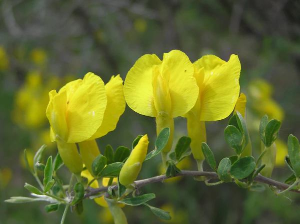 Цветки по 3—5 в пазухах листьев, образуют малоцветковое колосовидно-кистевидное соцветие. Чашечка трубчатая, волосистая, длиной 10—15 мм. Лодочка опушена, флаг голый. Венчик жёлтый, длиной 2—3 см. Цветут после облиствения в мае — июле на протяжении 25 дней, иногда цветут повторно в августе — сентябре.