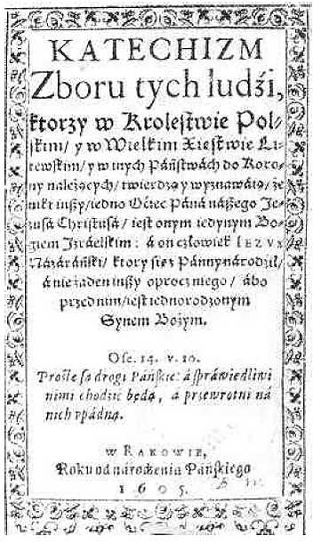 Полное его название: Katechizm Zboru tych ludźi, którzy w Królestwie Polskim / y w Wielkim Xięstwie Litewskim, y w innych Państwach do Korony należących / twierdzą i wyznawáią / że nikt inszy, iedno Oćiec Pana naszego Jezusa Christusa / iest onym iedynym Bogiem Izraelskim: á on człowiek J e z u s Nazareński / który się z Panny narodził/ á nie żaden inszy oprocz niego / ábo przed nim / iest jednorodzonym Synem Bożym. («Катехизис собора (церкви) людей, в Королевстве Польском и в Великом Княжестве Литовском, и в других землях Короны, утверждающих и признающих, что только Отец Господа нашего Иисуса Христа, есть единственным Богом Израильским, а человек Иисус из Назарета, рожденный Девой, и никто кроме него, или перед ним, есть единородным Сыном Божьим») содержит в себе отрицание божественности Иисуса Христа.