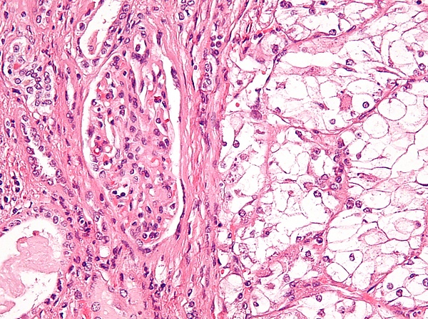 Возникновение различных гистологических разновидностей почечно-клеточного рака сопряжено с различного характера изменениями в геноме. Так, для светлоклеточного рака почки основным «драйверным» механизмом оказывается инактивация (делеция, гиперметилирование или миссенс-мутация) гена VHL (расположен на коротком плече 3-й хромосомы[36]). Такая инактивация ведёт к потере функций кодируемого данным геном белка-супрессора pVHL), отмечаемой почти в 100 % случаев наследственного и более чем в 75 % спорадического светлоклеточного рака. В результате, в частности, нарушается внутриклеточная регуляция уровня одного из транскрипционных факторов — фактора HIF (фактор, индуцируемый гипоксией), следствием чего оказывается неконтролируемое усиление ангиогенеза (последнее выступает как необходимое условие развития опухоли)[37].