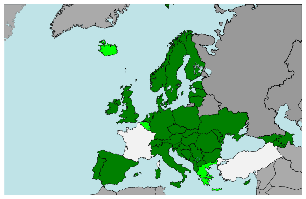 Из стран-членов Совета Европы не подписана Францией, Монако, Андоррой и Турцией; подписана, но не ратифицирована Бельгией, Грецией, Исландией и Люксембургом.[1]