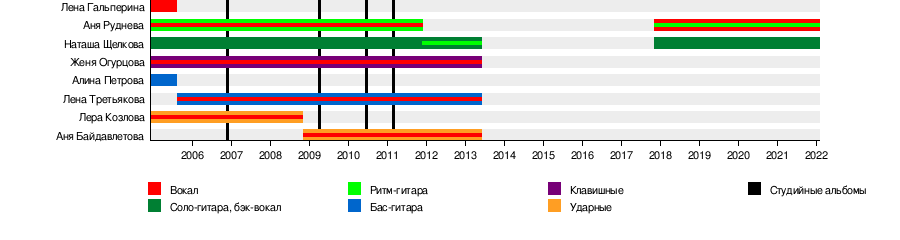 - Лена Ранетка (Елена Николаевна Третьякова, родилась 23 декабря 1988 года в Легнице, Польша) — бас-гитара, вокал. В прошлом серьёзно увлекалась футболом, играла за женскую команду «Чертаново», в составе которой стала чемпионкой России.
