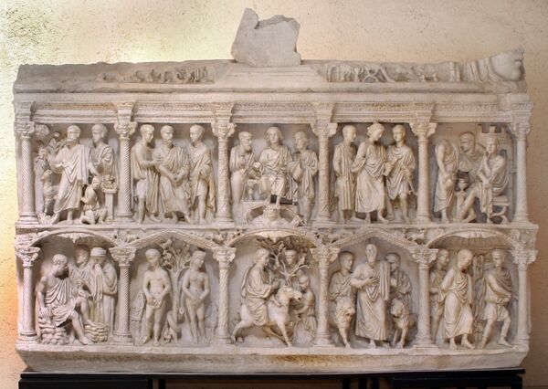Раннехристианские саркофаги, часто происходящие из катакомб и датируемые II—V вв., делались в тех же мастерских, что и языческие. Изготовление таких изделий, намного больше, чем росписи, требовало от автора профессиональной квалификации, мастерских. Поэтому скульптура дольше, чем живопись остается связанной с темами, образами, орнаментами традиционного искусства — и его техническими и стилистическими приемами. Но и тут наделение скульптуры христианской символики приводит к глубокому изменению характера изображений. Поскольку историко-мифологический сюжет утрачивает своё привычное значение и несет только идеологическое содержание, то в его исполнении исчезает нужда показать преемственность с предыдущими толкованиями. Показ прежнего смысла уводил бы зрителя от нынешнего переносного значения. Поэтому художник стремится не к изображению, а к «представлению» чего-то более значительного, чем сам образ. Структурно-синтаксическое построение сменяется несвязным повествованием, композиция часто подчиняется только орнаментальному замыслу. Рельефные части чередуются ритмически. В саркофаге «Доброго пастыря» главное действующее лицо изображено трижды на фоне сцен сбора винограда. Другие композиции, например, в саркофаге Юния Басса (ум. 359) повествование разделено на множество мелких эпизодов, вписанных в эдикулы. Единство изображаемой истории нарушается, рассказ теряет связность, живое действие сменено на череду образов. Техника упрощается и стремится к сильному воздействию на зрение, обобщенной моделировке фигур, резким светотеневым контрастам. Скульптор использует эффектную технику бурава.
