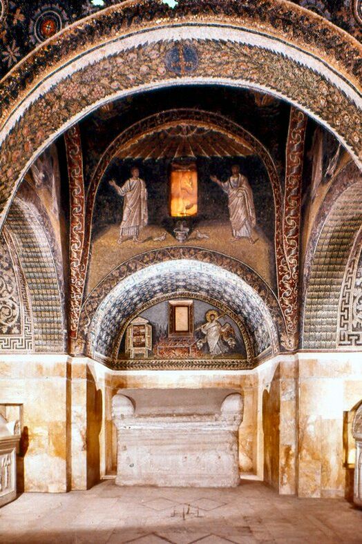Медиолан передал функции столицы городу Равенна, которая станет последним форпостом защиты имперских идей. Переносу столицы сюда способствовали окружающие болота и хорошо укреплённых военный порт Классе. В городе строят базилику Св. Иоанна по образцу медиоланской церкви Св. Симплициана (Сан-Симпличиано) и разрушенную позже Базилику Св. Креста. Сохранилась от Базилики Св. Креста только крестовая в плане часовня, которую неправильно называют Мавзолеем Галлы Плацидии, дочери императора Феодосия и сестры Гонория. На самом деле Галла Плацидия умерла в 450 г. в Риме и не была похоронена в Равенне. Снаружи маловыразительные, провинциальные стены «Мавзолея», выстроенные из красного кирпича, компенсированы роскошным декором — мозаиками, лучшими среди сохранившихся с той эпохи. Небольшие участки мозаик — достаточно привычны и в Риме, и в Медиолане. В «Мавзолее» же они покрывают всю поверхность стен и сводов, удивляют яркими красками и отраженным светом, полным символического значения.