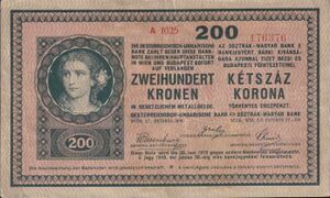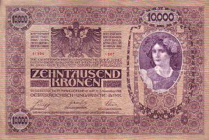 Австро-венгерская крона, ходившая по территории бывшей империи и после её распада, обесценилась. Причиной инфляции послужило увеличение количества банкнот в обращении. За несколько лет войны их число возросло в 13,17 раза[8]. В 1914 году крона на 30 % обеспечивались золотом, а к последним месяцам существования империи её обеспечение этим металлом составляло 1 %. В итоге банкнота по отношению к доллару США упала в 3,5 раза, а стоимость жизни выросла в 16,4 раза[8]. Постоянное падение кроны в цене негативно сказалось на товарном хозяйстве. Производители товаров не доверяли национальной валюте, отказываясь продавать за неё товар. Из-за этого частым явлением стали бартерные сделки. Кроме того, реальный процент по депозитам стал резко отрицательным, люди начали забирать из банков свои сбережения. Всё это было вызвано нестабильностью кроны.