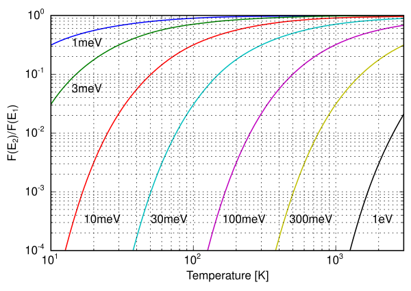 Распределение показывает, что состояния с более низкой энергией всегда будут иметь более высокую вероятность быть занятыми, чем состояния с более высокой энергией. Оно также может дать нам количественное соотношение между вероятностями того, что два состояния заняты. Отношение вероятностей состояний i и j задается как