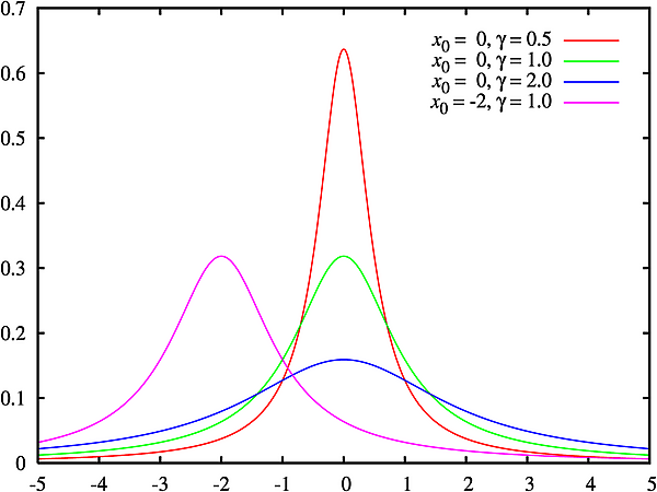 - В физике распределением Коши (называемым также формой Лоренца) описываются профили равномерно уширенных спектральных линий.