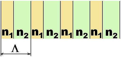 где — период РБО, целое число, указывающее на порядок дифракции, — длина волны, — эффективный показатель преломления РБО. Чаще всего в волоконной технике используются четвертьволновые распределённые РБО, толщина каждого слоя которых равна четверти длины волны. Так, для РБО, изображённого на Рис. 1, мы можем определить толщины слоев с показателями преломления и , соответственно, как и . Тогда, коэффициент отражения РБО на длине волны будет равен[10]: