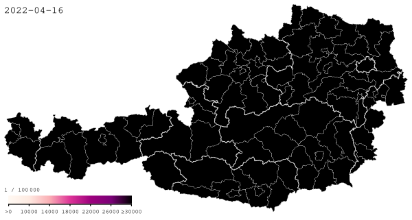 По данным на 24 декабря 2021 года, полностью вакцинировано от COVID-19 более 70 % населения Австрии[9]. При этом в октябре 2021 года санитарные власти Австрии отмечали рост числа заразившихся новой коронавирусной инфекцией после вакцинации: в некоторых регионах половину госпитализированных пациентов с COVID-19 составляли привитые[10].