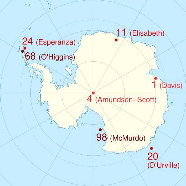 | Дэйвис, Моусон, Союз, Дружная, Чжуншань, Бхарати, Восток | 58 | 1 | 0 | [35][36] | ||