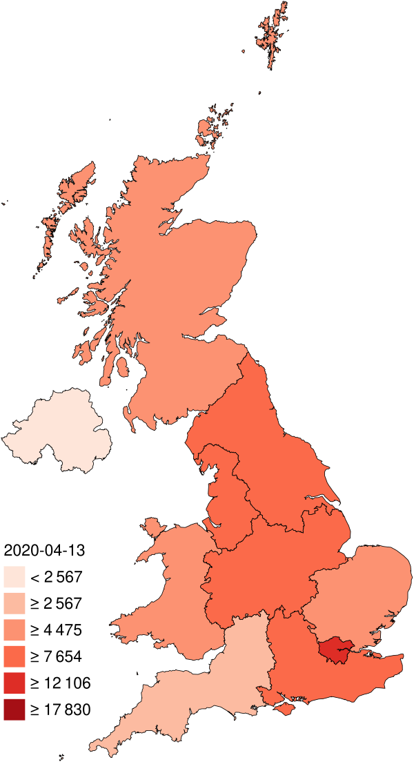 Цифры в таблицах ниже представляют только лабораторно подтвержденные случаи; однако, как указал главный научный советник правительства Великобритании сэр Патрик Валланс, вполне вероятно, что здесь отражены не все случаи заболевания коронавирусом в Великобритании (12 марта 2020 года было подтверждено 596 случаев, но общее число случаев было оценено в 5000—10 000)[63].
