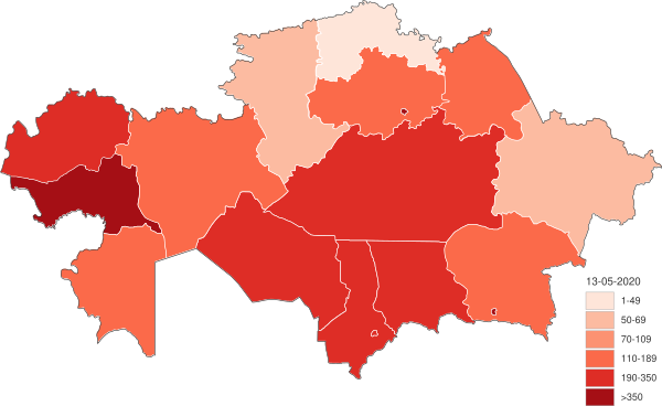 27 марта зарегистрированы первые случаи заражения в Атырауской[37], Павлодарской[38] и Мангистауской областях[39], 28 марта — в Восточно-Казахстанской и Кызылординской областях[40], 29 марта — в Западно-Казахстанской области[41], 31 марта — в Туркестанской области[42], 3 апреля — в Костанайской области[43].