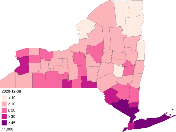 По состоянию на начало мая 2020 года почти треть известных случаев в США находится в штате Нью-Йорк. Более половины случаев в штате находятся в городе Нью-Йорке[5], где живёт почти половина населения штата.