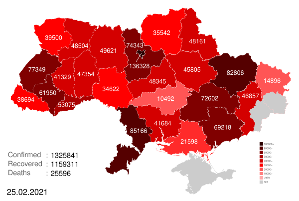 По состоянию на начало февраля 2021 на Украине подтверждено 1,23 млн случаев заражения коронавирусом. При этом 22 924 случаев с летальным исходом, более миллиона выздоровели.