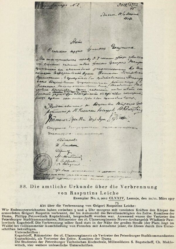 После Февральской революции захоронение Распутина было найдено, и Керенский приказал Корнилову организовать уничтожение тела[45]. Несколько дней гроб с останками простоял в специальном вагоне, а затем труп Распутина был сожжён ночью 11 марта в топке парового котла Политехнического института. Был составлен официальный акт о сожжении трупа Распутина[48].