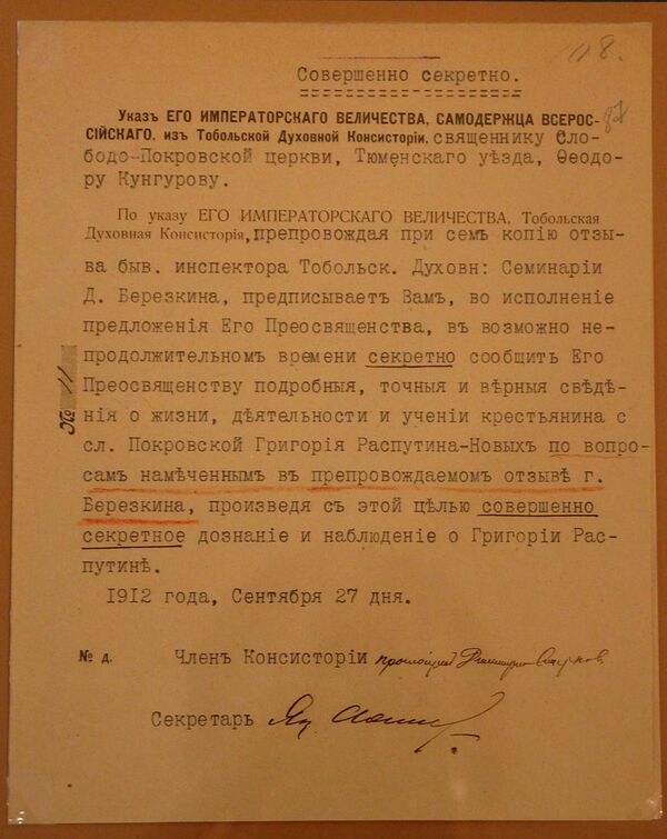 В 1903 году, ещё до пребывания Распутина в Петербург, в Тобольскую консисторию поступило донесение от местного священника Петра Остроумова[15], что Распутин «из своей жизни на заводах Пермской губернии вынес знакомство с учением ереси хлыстовской». Э.С. Радзинский отмечает, что в Покровское был отправлен следователь, но ничего порочащего он не обнаружил, и дело было сдано в архив[16].