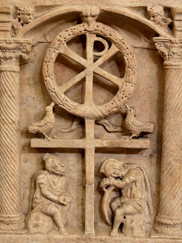 Для устрашения римляне казнили распятием преступников в покорённых провинциях. Поэтому в раннехристианском искусстве сцену Распятия не изображали. Её замещали символическими композициями: пеликан, кормящий своим телом птенцов (аллегория пасхальной жертвы; в композициях «Милосердие», «Поклонение жертве»). Крест распятия вызывал чувство отвращения, негодования, и его не связывали с древнейшим символом — солярным знаком[1]. В античных Элевсинских мистериях и в эзотерическом христианстве прохождение через смерть на кресте (символическое распятие) означало восхождение к новой, духовной жизни. «Распятия солнечного человека» были хорошо знаком древним индусам, персам, кельтам. Об этой символике писал древнегреческий философ Платон. В искусстве Индии встречаются изображения Кришны, распятого на дереве, его ноги и руки прибиты гвоздями. Согласно одной из гипотез, именно этот символ был перенесен в Персию (Распятие Митры) из Индии, а затем в Палестину, но он не связан с обычаем казни на кресте (орудие казни выглядело в виде буквы «Т» (Тау), представляло собой вертикальный столб с перекладиной наверху (crux commissa), что отлично от древнейшего солярного знака[2][3].