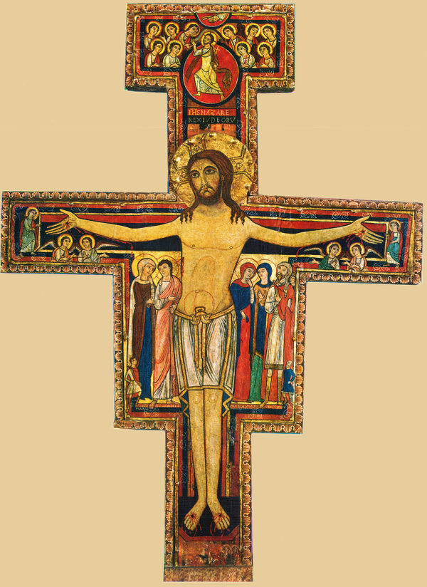 В то же время, в католической традиции распространены и продолжают широко почитаться старые распятия романского и «византийского» типа с четырьмя гвоздями. Среди них наиболее известен крест святого Дамиана из церкви в Ассизи, перед которым, по преданию, молился Франциск Ассизский, когда услышал призыв от Бога. Он, однако, является типичным примером итальянского распятия-иконы XII-ΧΙIΙ века, представленным многими образцами[16].