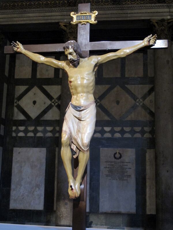 Наиболее знамениты Pаспятия работы Донателло для церкви Санта-Кроче и Ф. Брунеллески для церкви Санта-Мария-Новелла во Флоренции. Постепенно под влиянием эстетики итальянского Возрождения тип скульптурного Распятия становился всё более идеализированным. На этом фоне выделяется работа молодого Микеланджело. Это произведение семнадцатилетнего скульптора, обнаруженное только в 1962 году, показывает редкое соединение эстетики северных «красивых распятий» с новаторской идеей просветлённого образа спокойного, умиротворенного тела Спасителя, дух Которого соединился с Отцом. Микеланжело ради выразительности пластики дерзнул изобразить Христа полностью обнажённым. Юный и прекрасный Христос как бы заново родился на кресте. Эти изменения в иконографии связывают с влиянием проповедей Савонаролы, приверженцем которого на протяжении всей жизни был Микеланджело. Примерно за два года до создания «Распятия» Микеланджело доминиканский монах описал «благородное хрупкое, нежное, чувствительное сложение» Христа. В поздние годы Микеланджело обратился к средневековой форме вилкообразного креста, а в одном из рисунков, сделанных им для маркизы Виттории Колонны (между 1538 и 1541 годами), изобразил Христа на кресте живым, с молящим взором, обращённым к небу[10].
